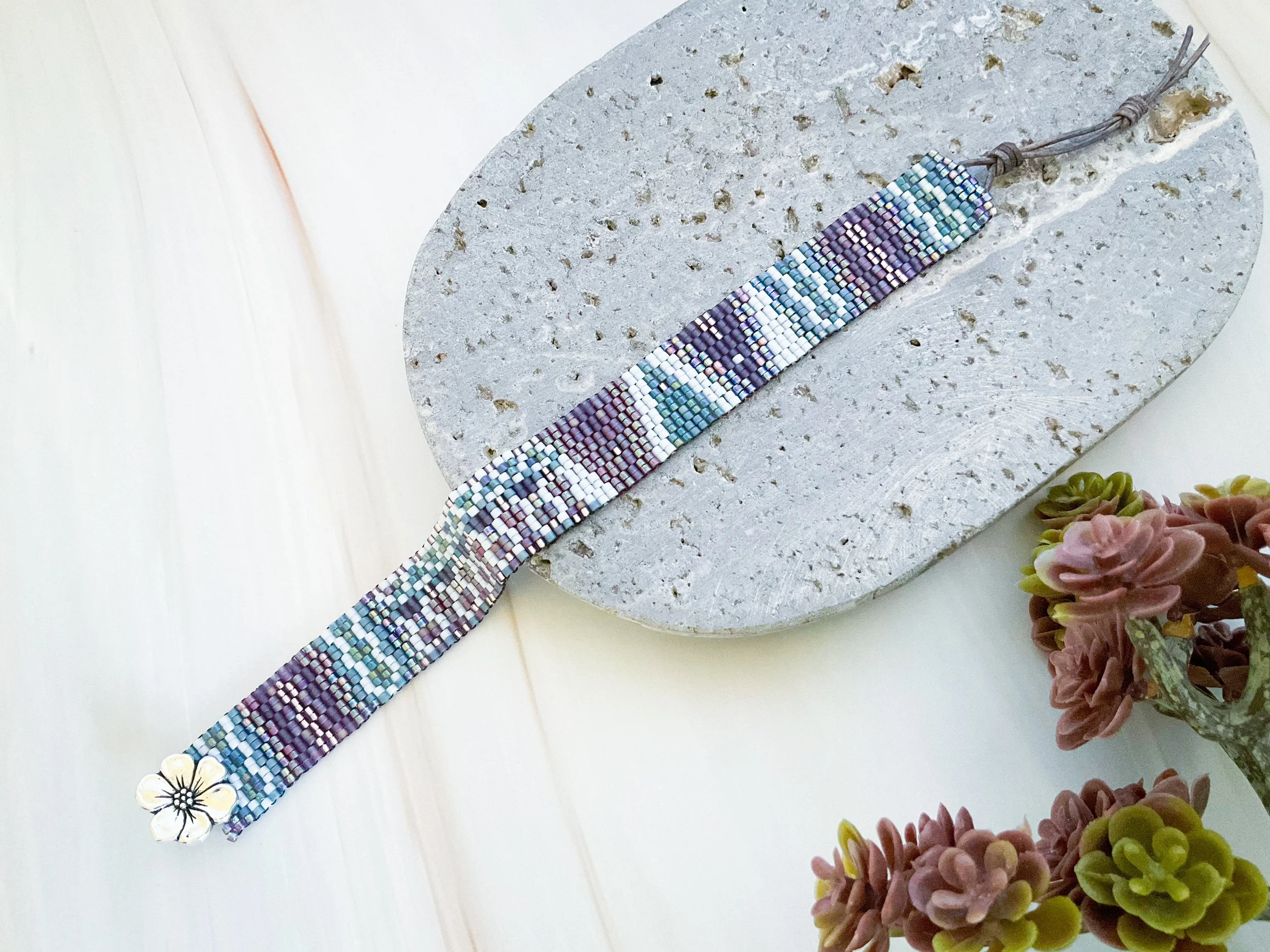 July 2025 - Cactus Blossom Bracelet, Even-Count Peyote Bracelet with Button and Leather Cuff Video