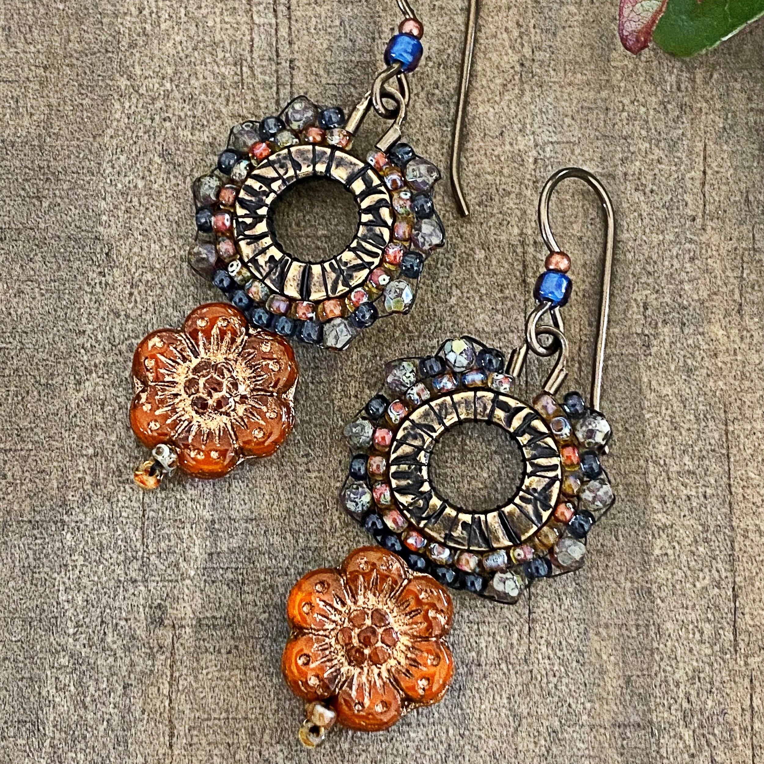 These earrings are some of my favorite to create! The Montana blue with the saffron flame and amethyst Picasso, on the oxidized brass, with the gorgeous sunset colored wild roses, gives these earrings all the summer warmth! Here is the step-by-step tutorial featured in my shop for the kits! I also carry these charming wild roses from Raven’s Journey Glass in my shop. xoxo Danielle